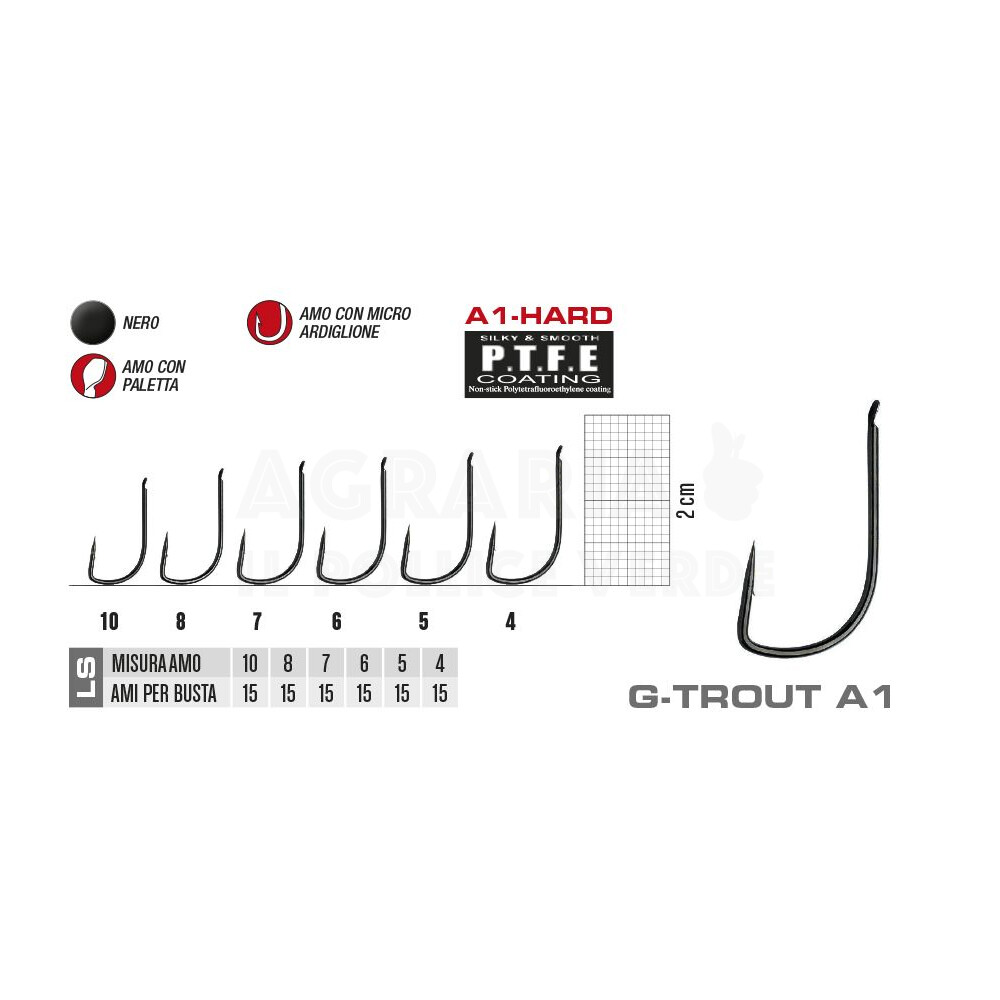 Tutte le specifiche del 607N trasferite nella linea G-Trout A1: struttura sovradimensionata, curva a gomito, punta alta e micro ardiglione ribassato.