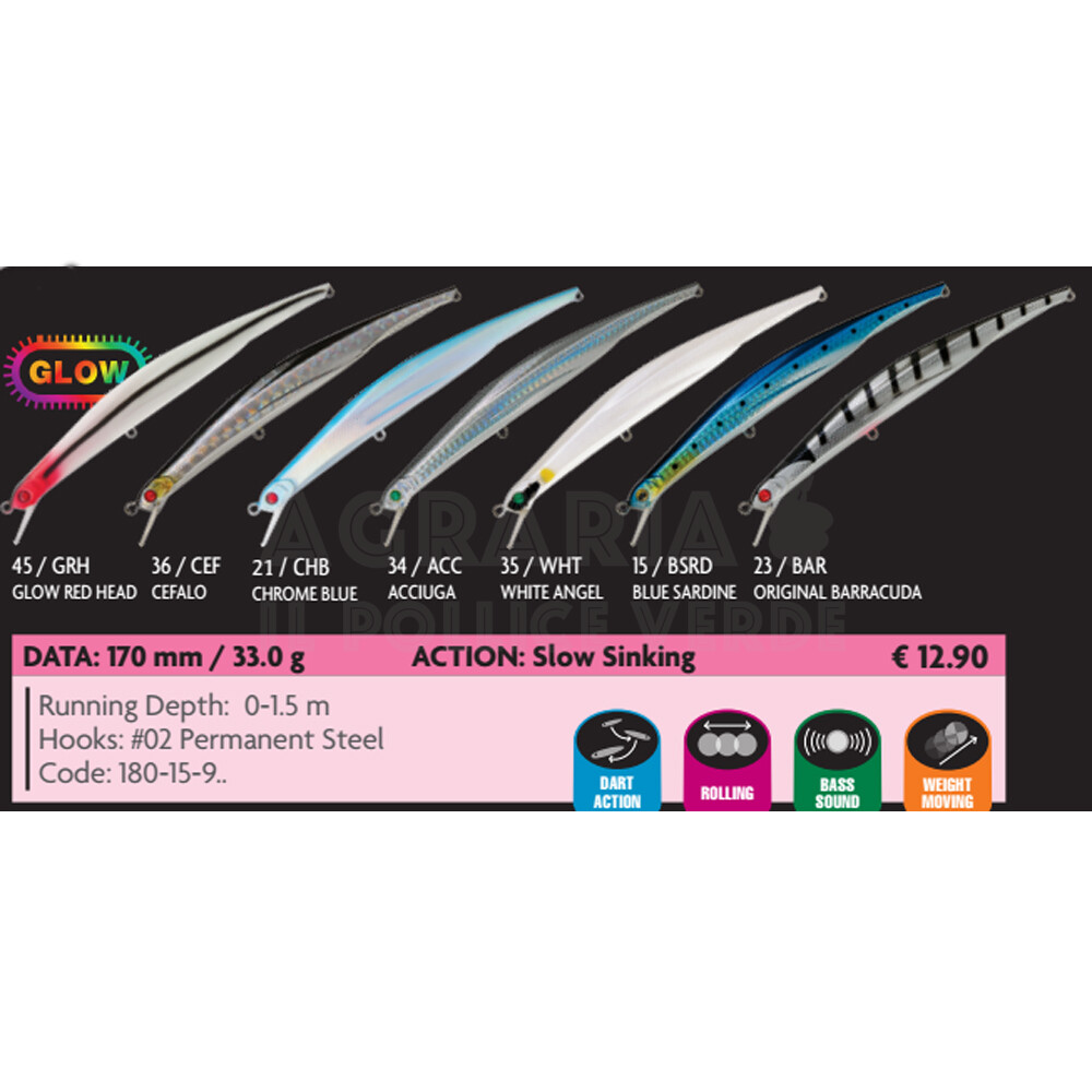 Ideale quindi per la pesca del barracuda anche in acque basse, dal momento che l’azione slow sinking permette di farlo lavorare anche in un 40 cm. con canna alta.