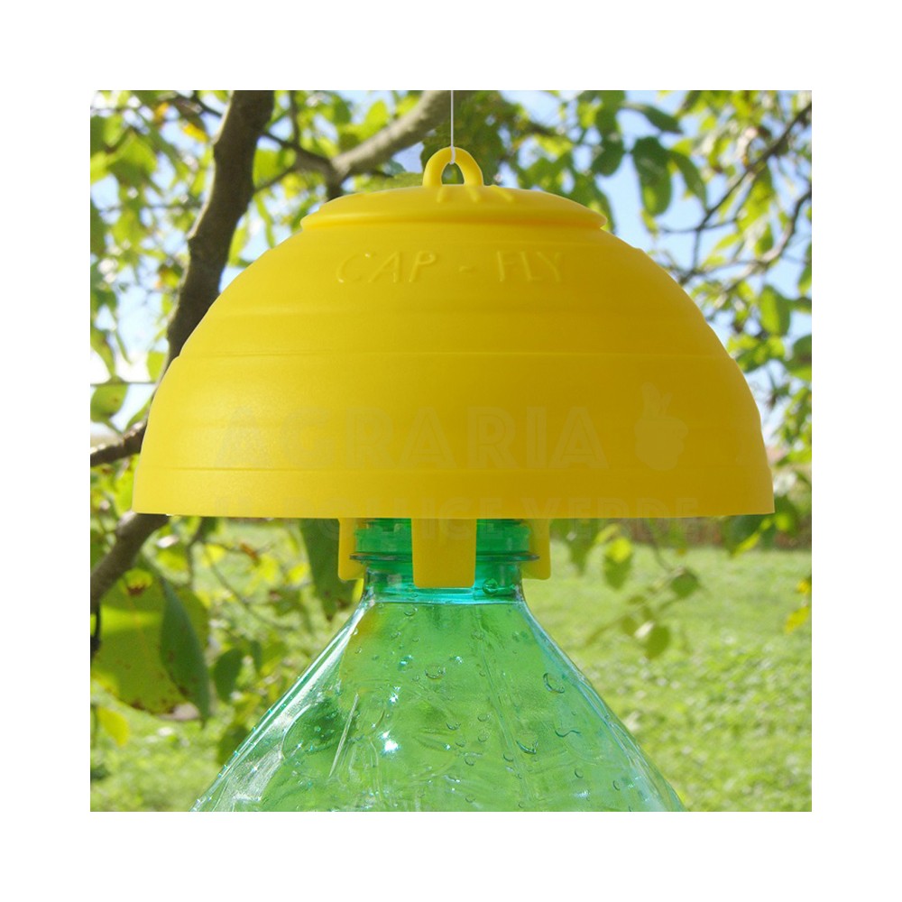 CAP-FLY TRAP è una trappola ecologia universale costituita da uno speciale tappo giallo applicabile ad una comune bottiglia dell’acqua in plastica. Il tappo posizionato correttamente consente una protezione da mosche e insetti nocivi in uliveti, frutteti, vigneti, pollai, stalle, allevamenti, scuderie, canili, giardini, terrazze, etc.