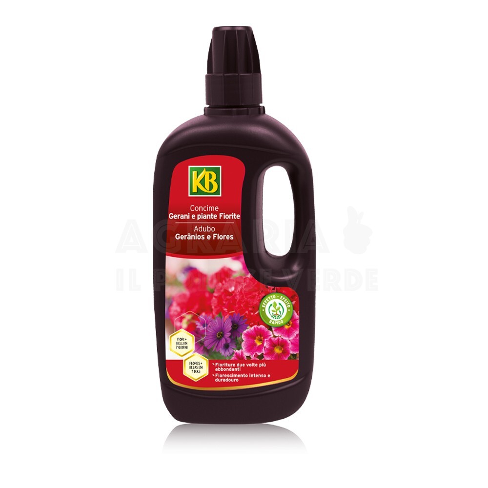 Concime liquido ideale per nutrire gerani, surfinie, ciclamini, piante da fiore in genere. Contenente azoto, fosforo e potassio (NPK) in rapporto equilibrato per favorire fioriture