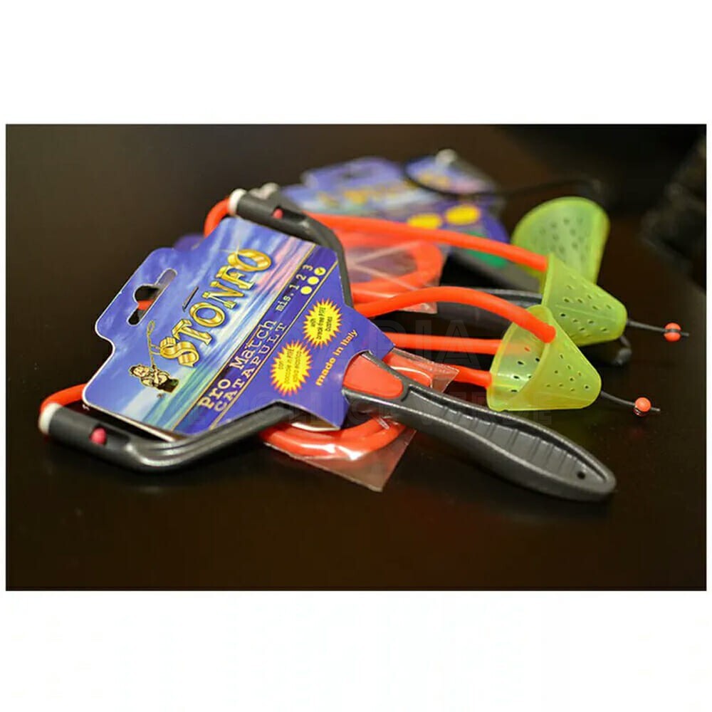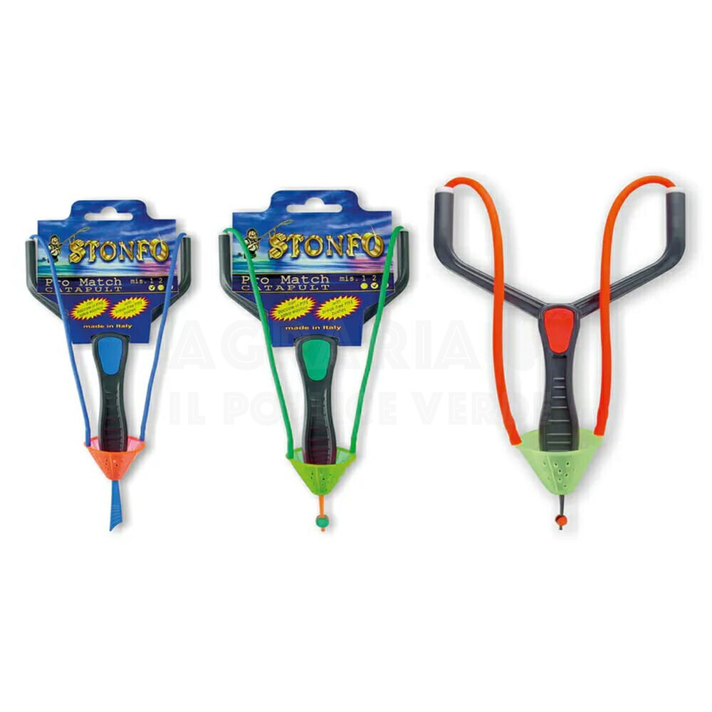 Fionde da gara con impugnatura anatomica soft touch, permettono la massima precisione utilizzando la minima quantità di esche. Munite di boccole in Ptfe salva elastico.