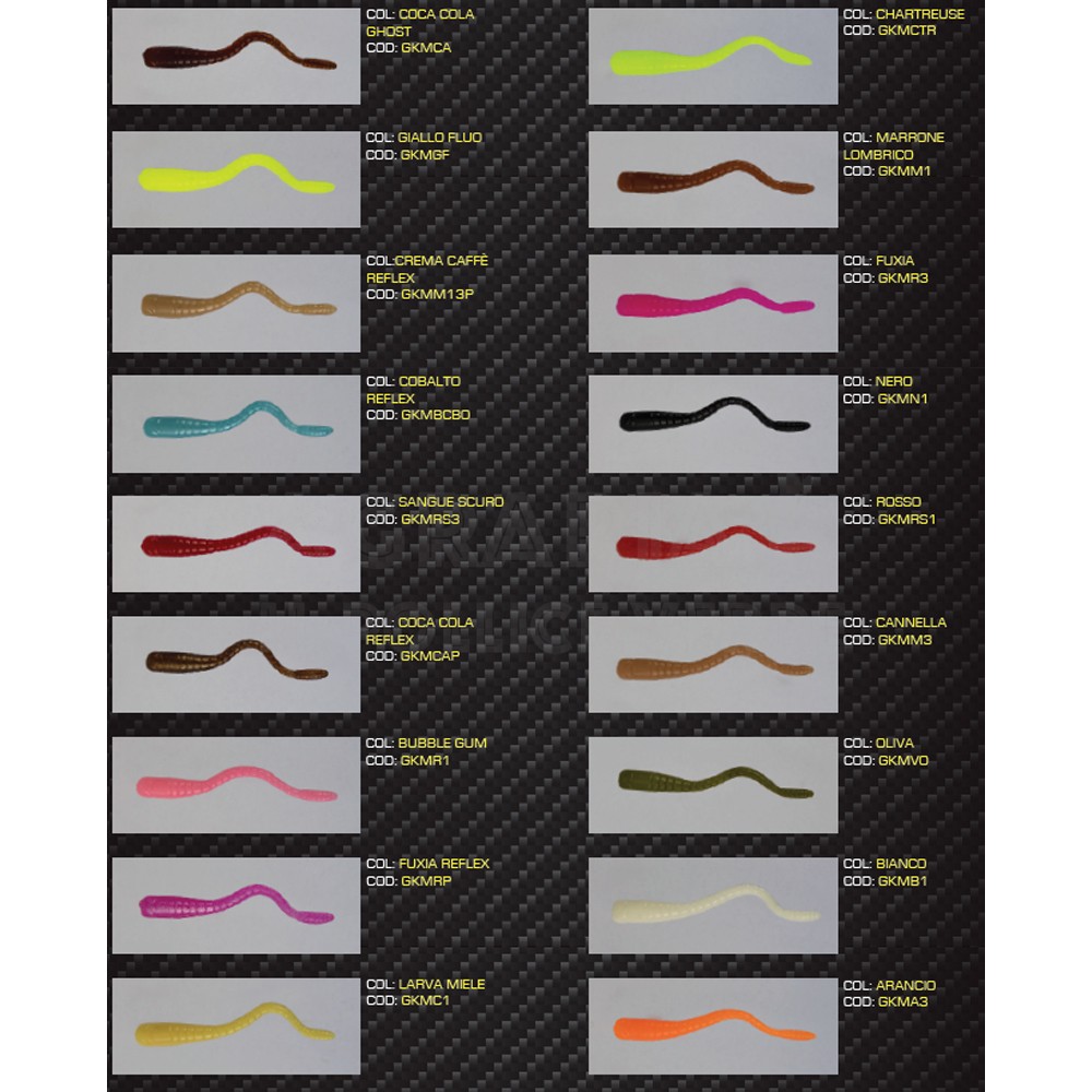 IL CORPO E FORMATO DA UNA TESTA DI DIAMETRO 5 MM CHE SI TRAMUTA SUBITO IN UNA LUNGA CODINA MOLTO SINUOSA IN ACQUA. QUESTA ESCA FATTA SALTELLARE TRA I SASSI O USATA IN ROTAZIONE HA UN MOVIMENTO DEL TUTTO UNICO E MOLTO ATTRATTIVO. TUTTE LE ESCHE SONO AROMATIZZATE INTERNAMENTE E GONFIATE A FREDDO CON AMINOACIDI, PROTEINE, FEROMONI E COMPOSTO ORGANICO.