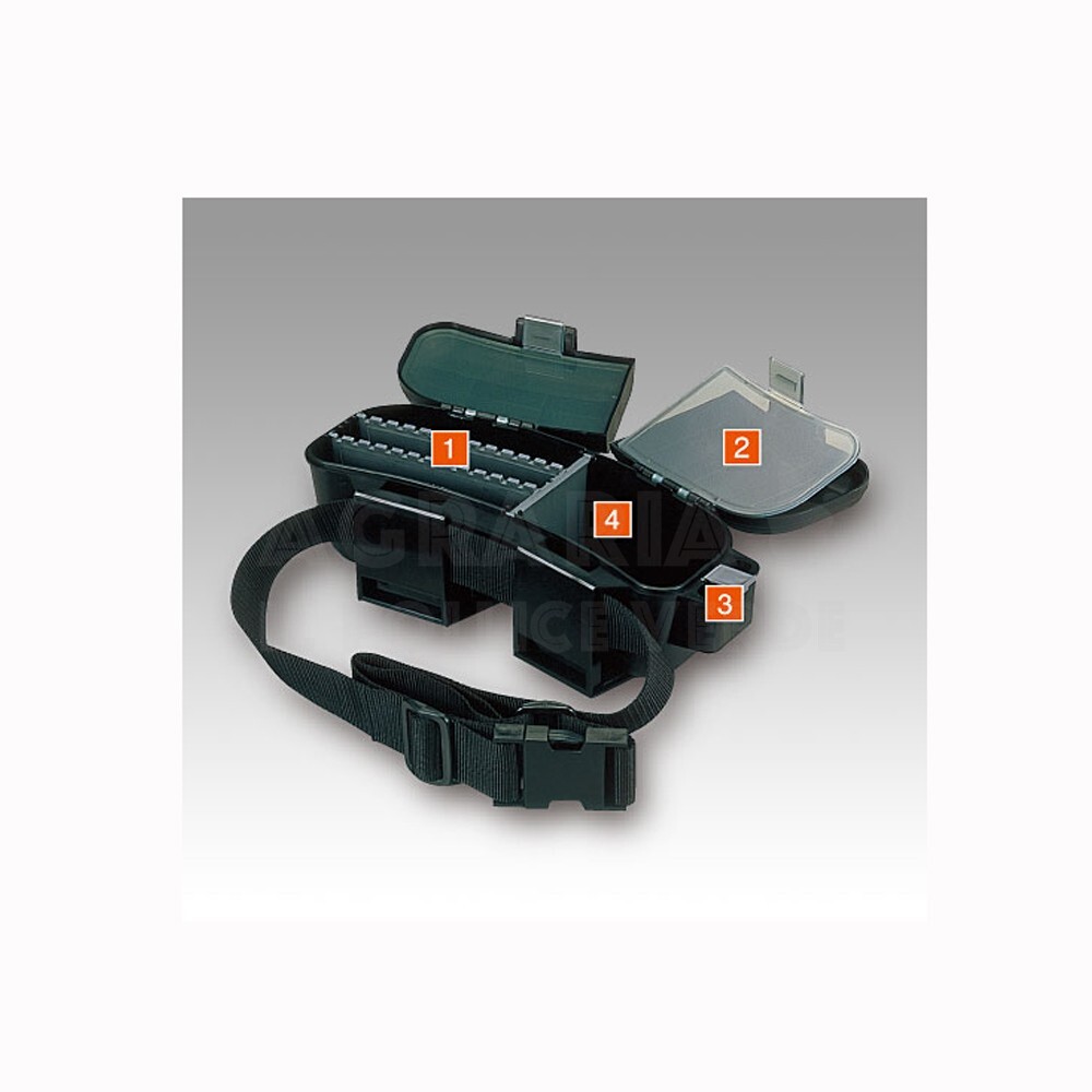 VS-5010 include un sistema di suddivisione in rack rimovibile per una facile posizionamento di esche per spinner, metallo e altre esche. Moschettoni, girelle, perline, piccoli vermi e altri accessori possono essere riposti all’interno degli scomparti del coperchio. Il portautensili può contenere una pinza in posizione
