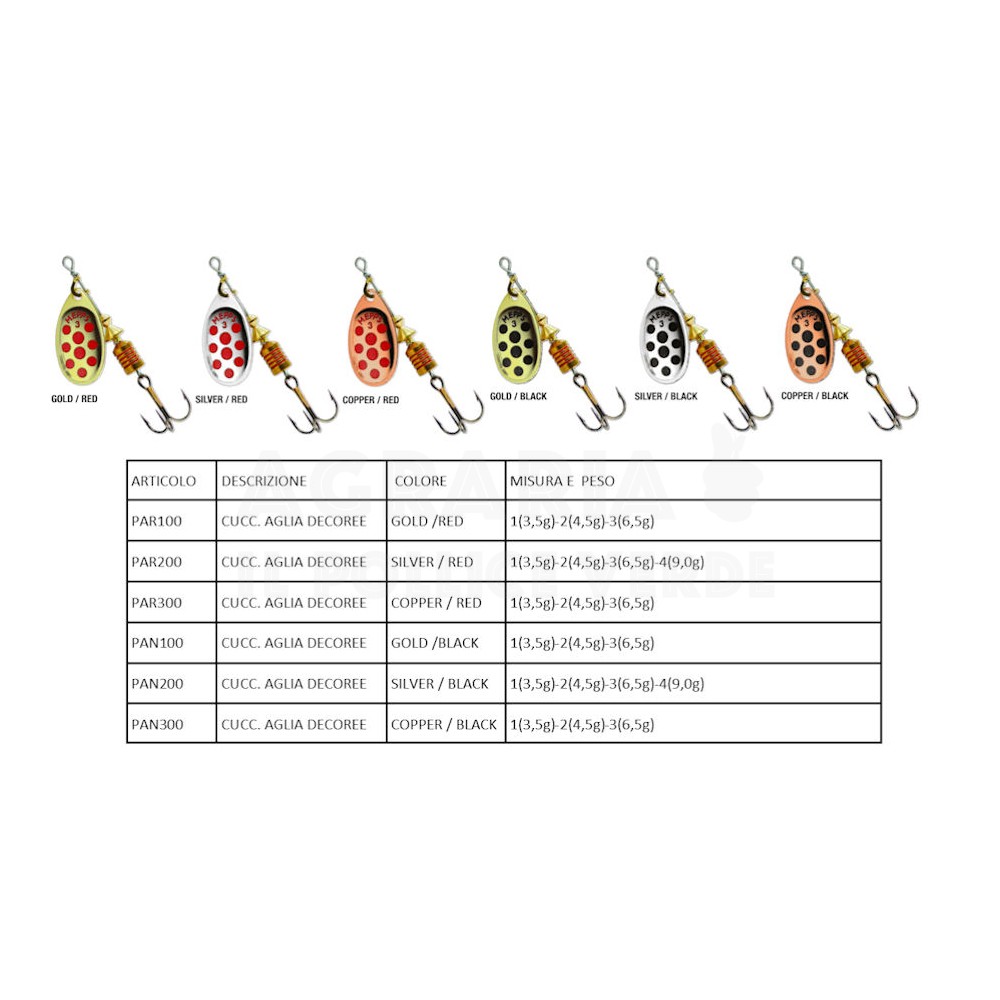 Versione del modello Aglia decorata con pallini colorati.Forse il modello più conosciuto ed usato dai pescatori a spinning,nei torrenti, nei canali, nei fiumi, nei laghetti a pagamento ed anche in mare ha sempre dimostrato la sua funzionalità visto che è il più imitato!