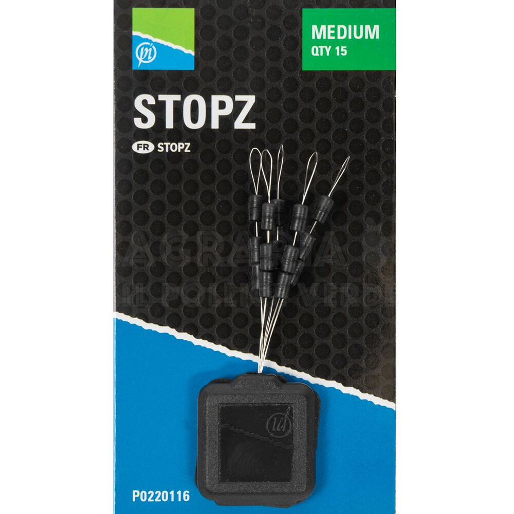 Pratici stop di fermo facilmente trasferibili sulla lenza madre, ideali per fermare waggler o feeder. Il profilo degli Stopz una volta inseriti sulla linea aiuta a creare un rig aerodinamico. Trasferite i fermi sulla linea uno per uno per evitare di danneggiare il filo. Disponibile in due misure.