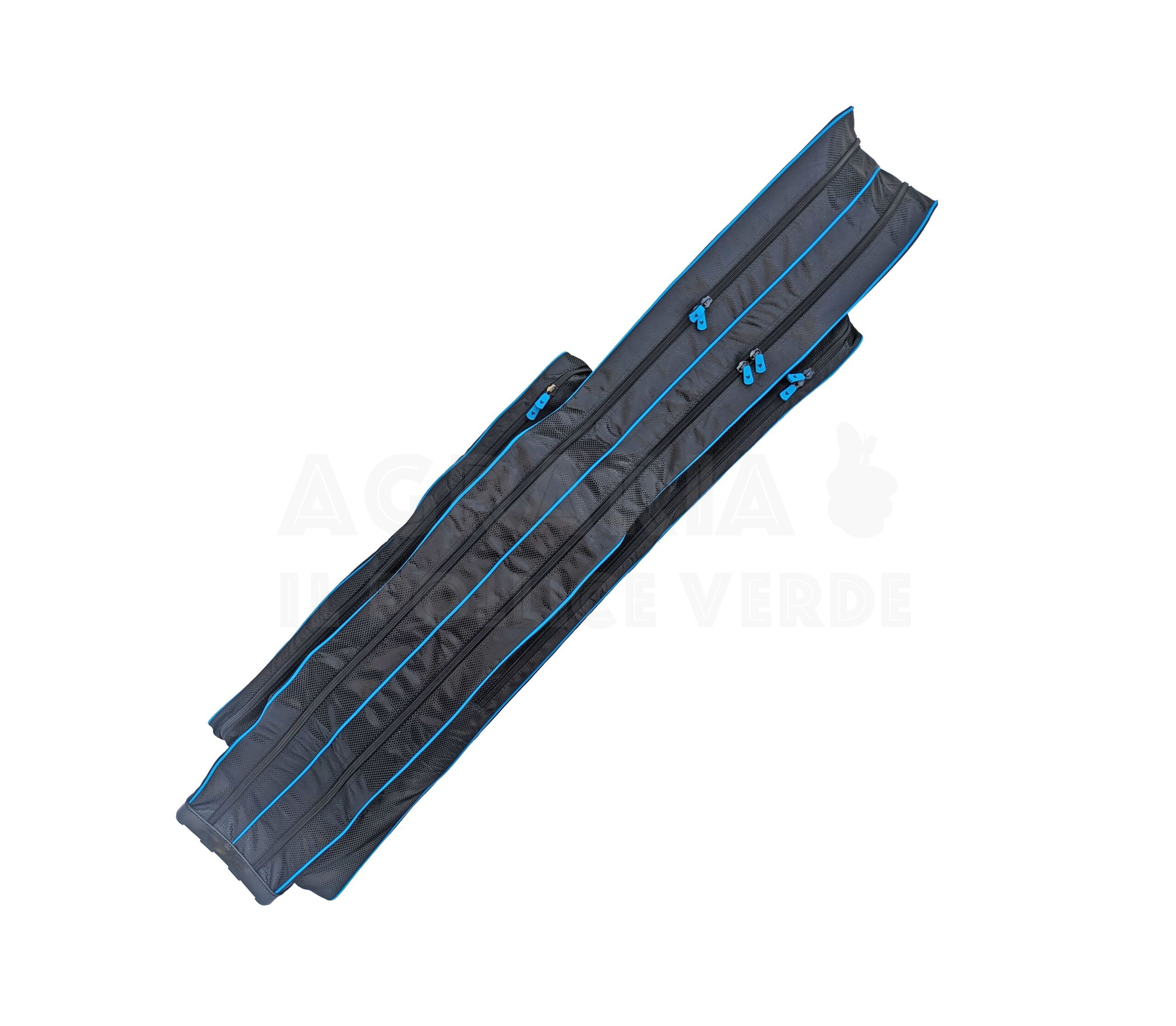 canne già montate. Dotato di un vano principale con divisori imbottiti che mantengono i mulinelli separati e protetti. Dispone inoltre di due tasche esterne. Tracolla imbottita e maniglia per il trasporto.
