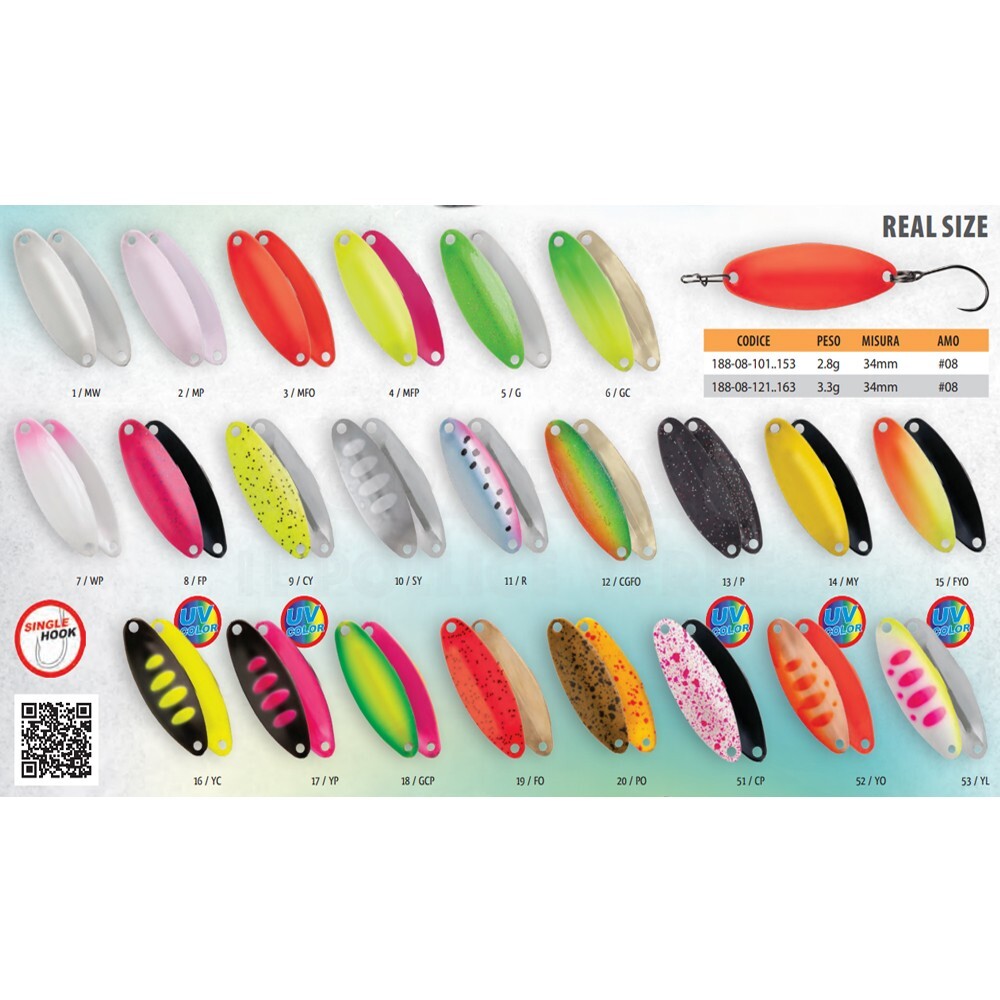 Sviluppata e testata dallo Staff Rapture nelle più varie situazioni di pesca, questa nuova serie di spoon dedicati all’Area Trout rivela una particolare forma che consente allo spoon, utilizzando recuperi regolari, di rimanere perfettamente in assetto orizzontale nella fascia di acqua frequentata dalla trota. Progettato per lunghi lanci, sviluppa un nuoto con efficaci oscillazioni laterali irresistibili all’istinto predatore della trota. I materiali Made in Japan con cui vengono realizzati gli spoon Rapture vantano ami singoli senza ardiglione con punta affilata chimicamente 3D Cut.