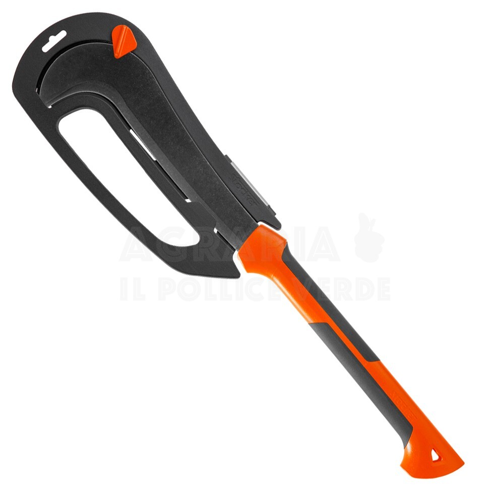 È dotata di una lama da 30 cm in acciaio al carbonio di altissima qualità e manico ergonomico super-leggero, con inserti anti scivolo e interno vuoto per ridurre le vibrazioni causate dall’impatto con il legno. La curvatura alle due estremità del manico è progettata per la sicurezza, evita infatti che l’attrezzo scivoli dalle mani o che la mano dell’operatore venga a contatto con la lama. Completa di pratica custodia con affilalame integrato, per affilare il filo della lama anche durante il lavoro, e passante per cintura integrato, per un trasporto sicuro e comodo.