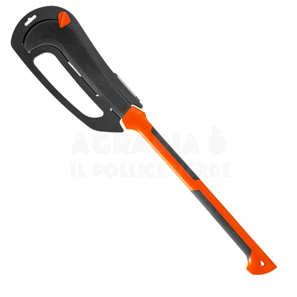 È dotata di una lama da 30 cm in acciaio al carbonio di altissima qualità e manico ergonomico super-leggero, con inserti anti scivolo e interno vuoto per ridurre le vibrazioni causate dallimpatto con il legno. La curvatura alle due estremità del manico è progettata per la sicurezza, evita infatti che l’attrezzo scivoli dalle mani o che la mano dell’operatore venga a contatto con la lama. Completa di pratica custodia con affilalame integrato, per affilare il filo della lama anche durante il lavoro, e passante per cintura integrato, per un trasporto sicuro e comodo.