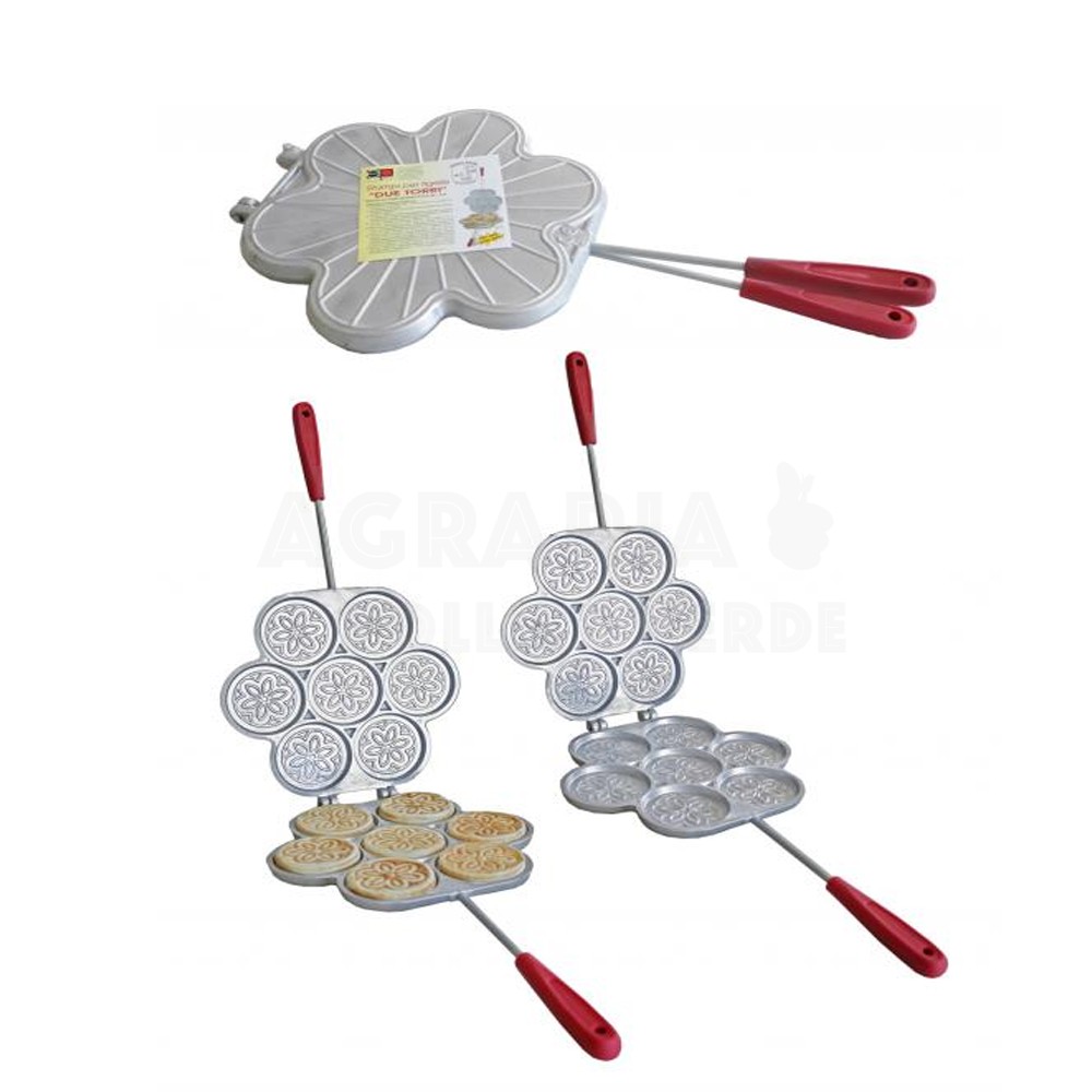 Stampo per tigelle 7 posti speciale (pesante) in alluminio per alimenti. Diametro tigella cm 9.5 x h 1.8 Lo stampo speciale si differenzia dagli altri stampi per il peso: quello speciale è il vecchio stampo tradizionale, costruito con uno spessore più grosso di conseguenza più pesante e un pò meno maneggevole da girare ma d’ha una cottura “migliore” perchè quando ha raggiunto la temperatura mantiene per più tempo il calore.